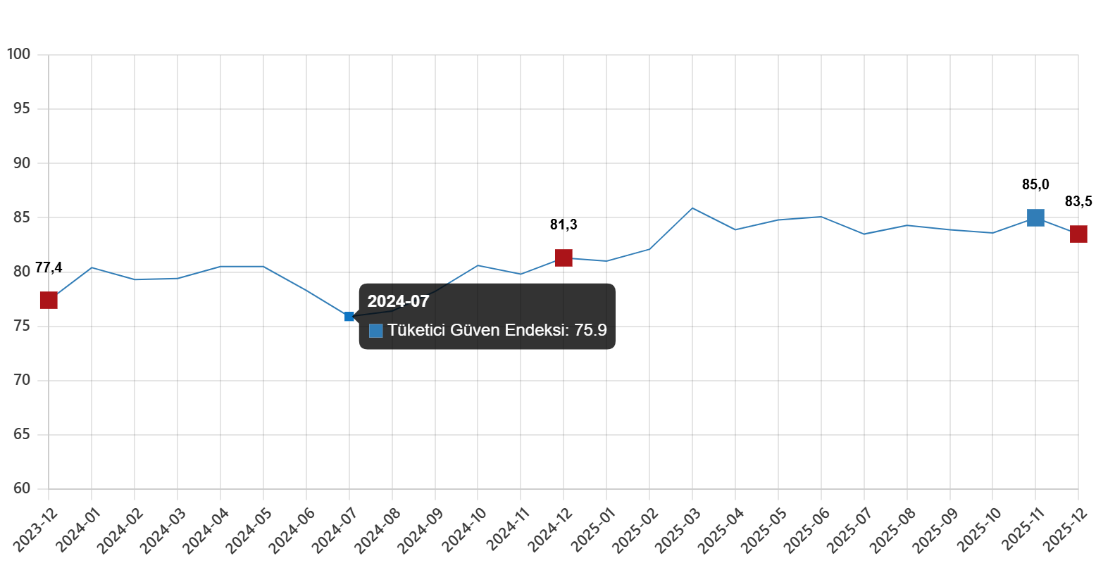 Türkiye İstatistik Kurumu ve Türkiye Cumhuriyet Merkez Bankası işbirliği ile yürütülen tüketici eğilim anketi sonuçlarından hesaplanan tüketici güven endeksi, Kasım ayında 85,0 iken Aralık ayında %1,8 oranında azalarak 83,5 oldu.