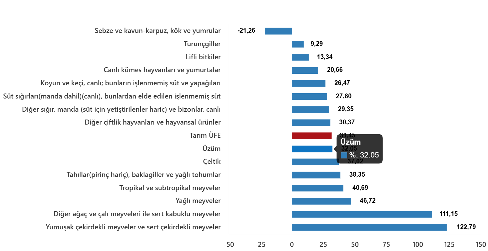 Tarım ürünleri üretici fiyat endeksi (Tarım-ÜFE) yıllık %31,45 arttı, aylık %1,56 azaldı
