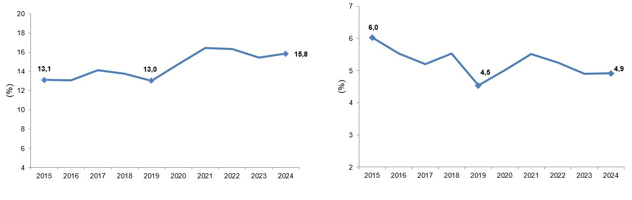 Girişimlerin doğum oranı (%), 2015-2024 Doğan girişimlerin istihdam yaratma payı (%), 2015-2024