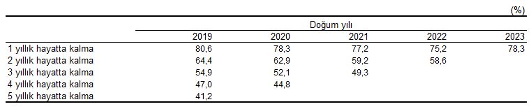 Doğum yıllarına göre hayatta kalma göstergeleri (%), 2019-2023