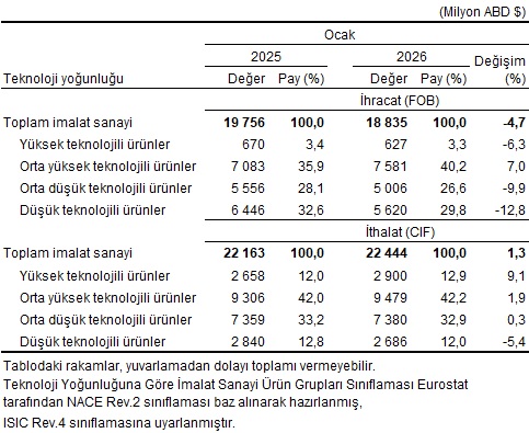 Teknoloji yoğunluğuna göre imalat sanayi ürünleri dış ticareti, Ocak 2026