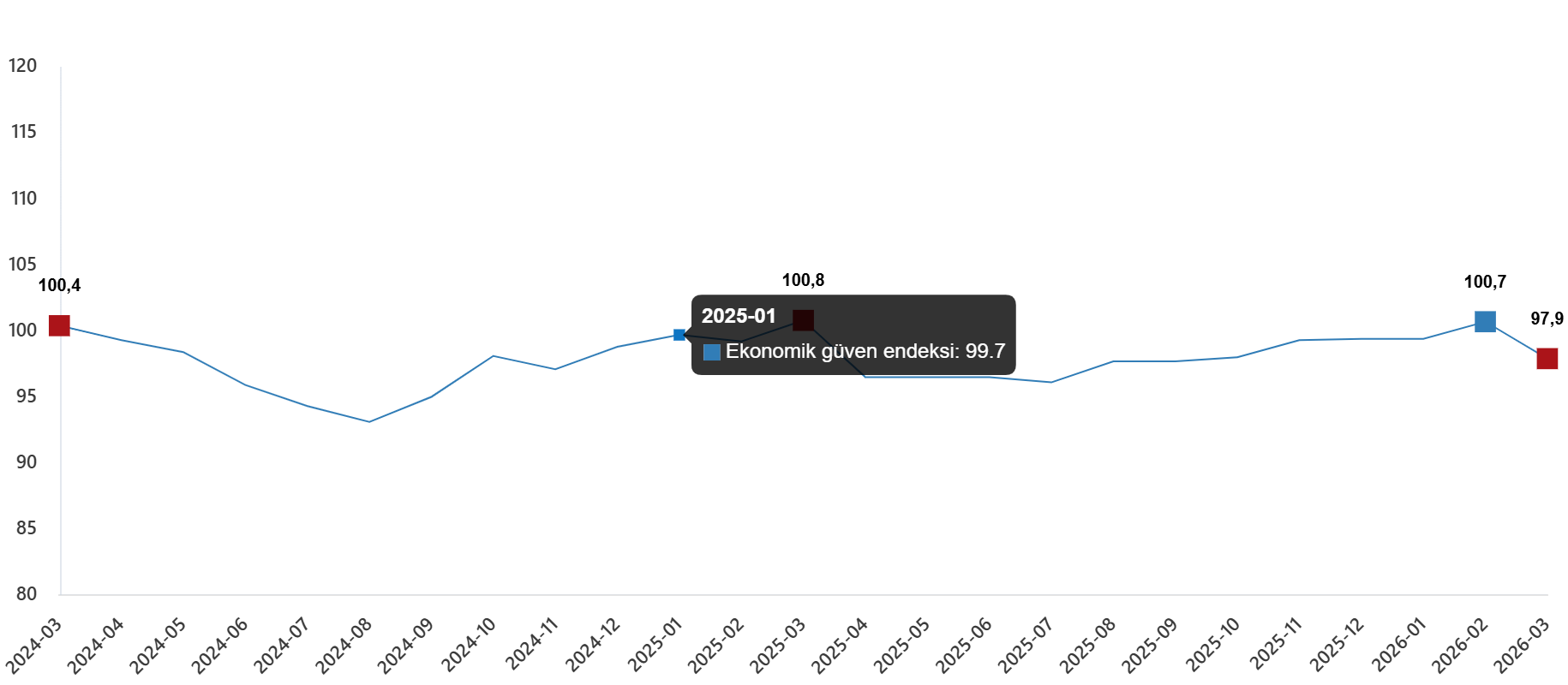 Ekonomik güven endeksi Şubat ayında 100,7 iken, Mart ayında %2,8 oranında azalarak 97,9 değerini aldı.