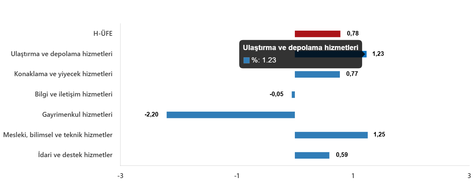Bir önceki aya göre, ulaştırma ve depolama hizmetlerinde %1,23 artış, konaklama ve yiyecek hizmetlerinde %0,77 artış, bilgi ve iletişim hizmetlerinde %0,05 azalış, gayrimenkul hizmetlerinde %2,20 azalış, mesleki, bilimsel ve teknik hizmetlerde %1,25 artış, idari ve destek hizmetlerde %0,59 artış gerçekleşti.
