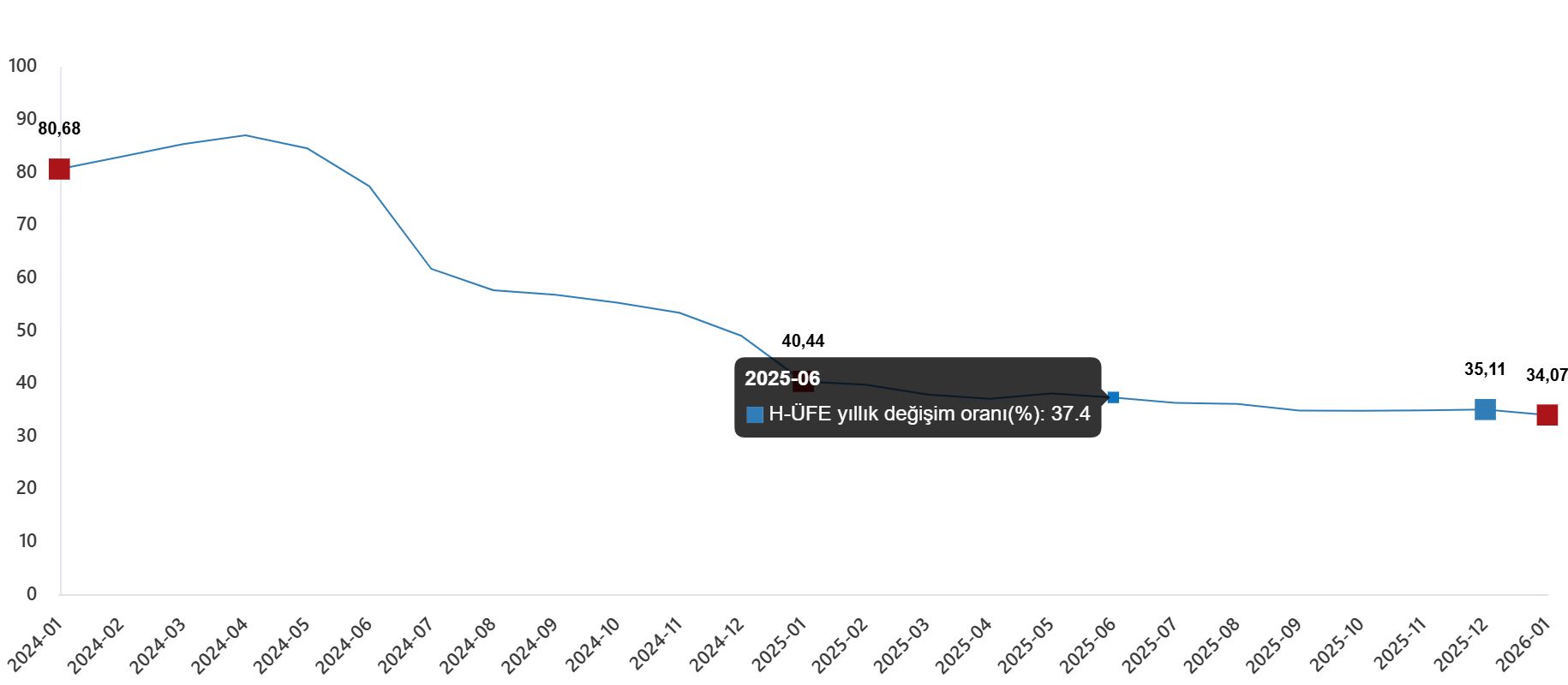 H-ÜFE 2026 yılı Ocak ayında bir önceki aya göre %7,74 artış, bir önceki yılın Aralık ayına göre %7,74 artış, bir önceki yılın aynı ayına göre %34,07 artış ve on iki aylık ortalamalara göre %36,27 artış gösterdi.
