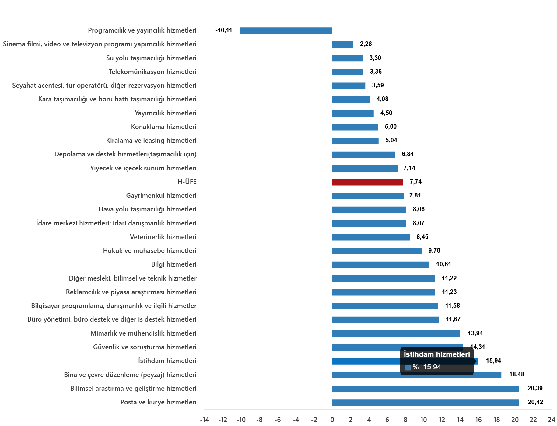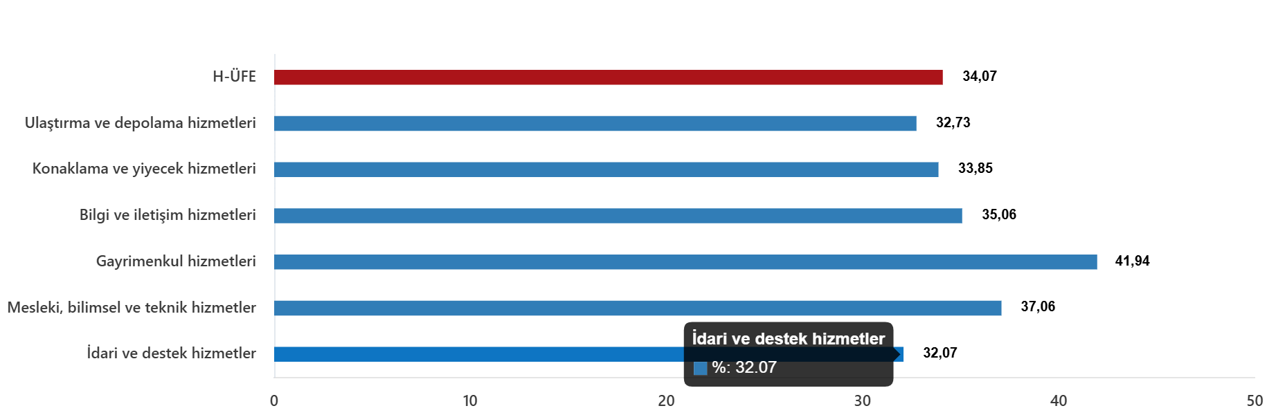 Bir önceki yılın aynı ayına göre, ulaştırma ve depolama hizmetlerinde %32,73 artış, konaklama ve yiyecek hizmetlerinde %33,85 artış, bilgi ve iletişim hizmetlerinde %35,06 artış, gayrimenkul hizmetlerinde %41,94 artış, mesleki, bilimsel ve teknik hizmetlerde %37,06 artış, idari ve destek hizmetlerde %32,07 artış gerçekleşti.