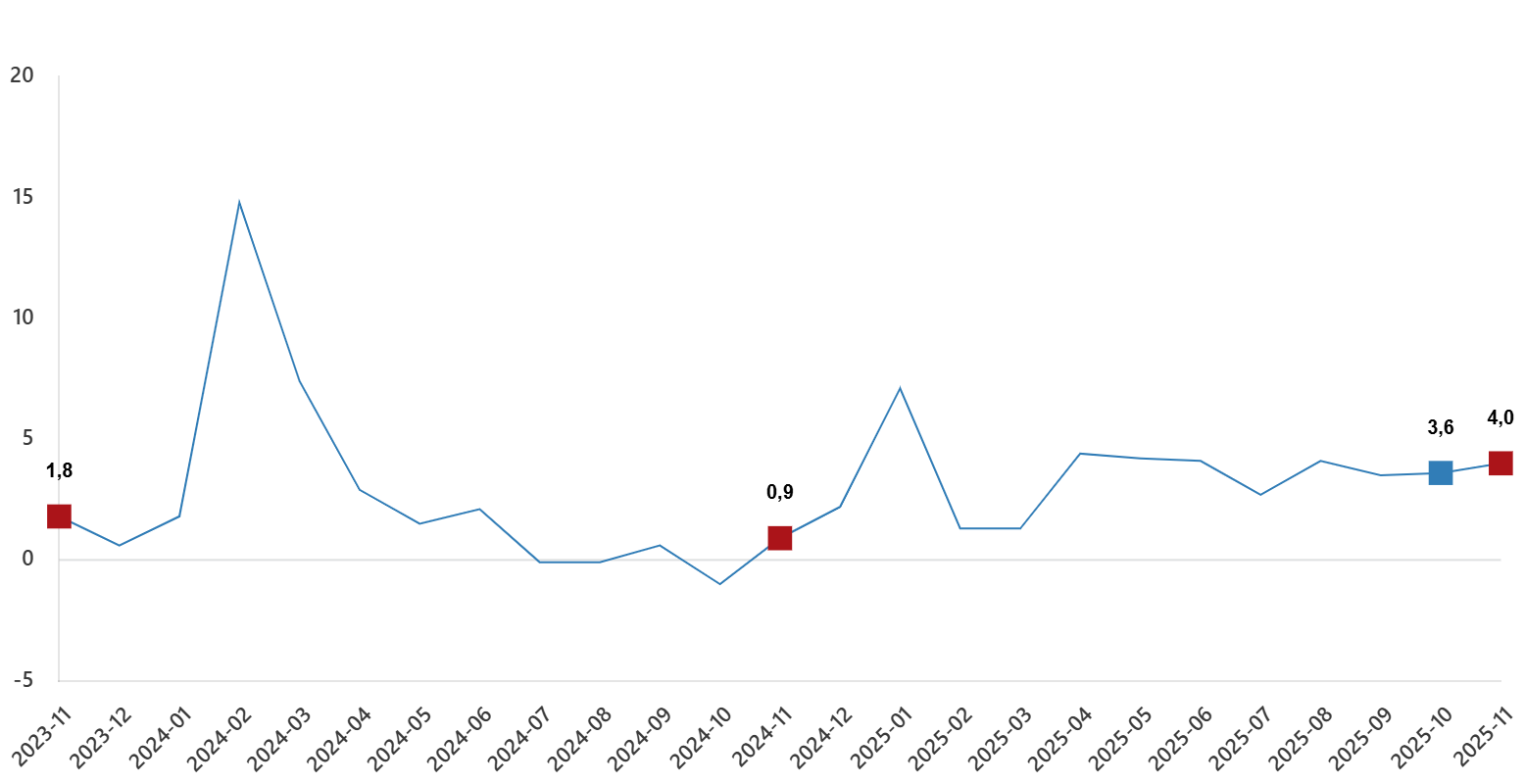 Hizmet üretim endeksi (2021=100) 2025 yılı Kasım ayında bir önceki yılın aynı ayına göre %4,0 arttı. Aynı ayda ulaştırma ve depolama hizmetleri %1,6 arttı, konaklama ve yiyecek hizmetleri %7,2 arttı, bilgi ve iletişim hizmetleri %8,7 arttı, gayrimenkul hizmetleri %3,0 arttı, mesleki, bilimsel ve teknik hizmetler %1,7 arttı, idari ve destek hizmetleri ise %5,1 arttı.