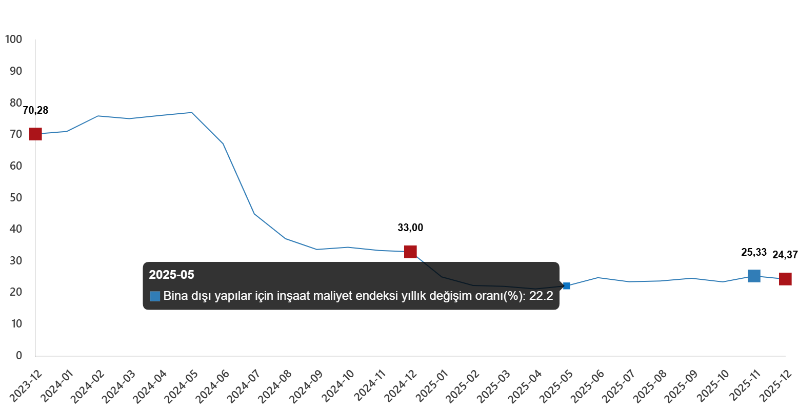 Bina dışı yapılar için inşaat maliyet endeksi yıllık değişim oranı(%), Aralık 2025