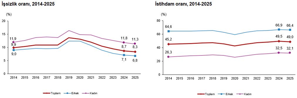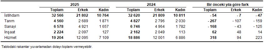 İstihdam edilenlerin sayısı 2025 yılında bir önceki yıla göre 54 bin kişi azalarak 32 milyon 566 bin kişi, istihdam oranı ise 0,5 puan azalarak %49,0 oldu. Bu oran erkeklerde %66,4 iken kadınlarda %32,1 olarak gerçekleşti.