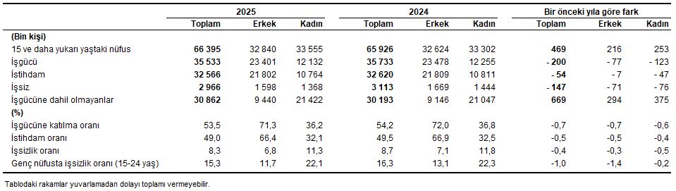 İşgücü 2025 yılında bir önceki yıla göre 200 bin kişi azalarak 35 milyon 533 bin kişi, işgücüne katılma oranı ise 0,7 puan azalarak %53,5 olarak gerçekleşti. İşgücüne katılma oranı erkeklerde %71,3, kadınlarda ise %36,2 oldu.