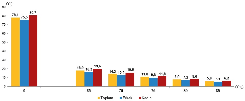 Türkiye’de 65 yaşına ulaşan bir kişinin beklenen yaşam süresi ortalama 18,0 yıl oldu. Erkekler için bu sürenin 16,3 yıl, kadınlar için 19,6 yıl olduğu gözlendi. Diğer bir ifade ile 65 yaşına ulaşan kadınların erkeklerden ortalama 3,3 yıl daha fazla yaşayacağı tahmin edildi. Beklenen yaşam süresi 75 yaşında 11,0 yıl iken 85 yaşında 5,8 yıl oldu.