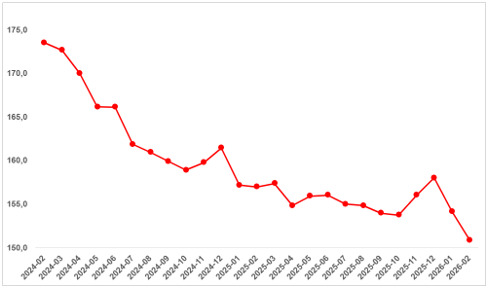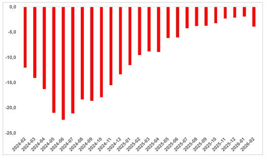 Şubat ayı verilerine göre reel konut fiyat endeksi bir önceki aya göre yüzde 2,1 düşüş gösterdi. 2026 yılının Ocak ayında yeniden düşüşe geçen reel fiyatlardaki bu eğilim şubat ayında da devam etti