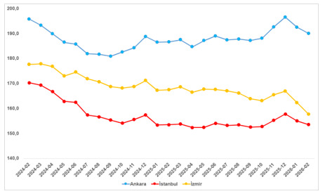 Reel satış fiyatlarındaki değişim ülke genelinde olduğu gibi İzmir’de negatif, İstanbul’da yatay ve Ankara’da pozitif seyretti. Şubat ayında yıllık reel fiyat değişimi İstanbul’da yüzde 0, İzmir’de yüzde 5,9 düşüş, Ankara’da ise yüzde 1,8 artış olarak gerçekleşti.