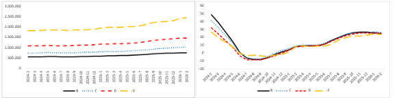 Şekil 2: Araç sınıfına göre ortalama otomobil fiyatı (TL) (Sol panel), araç sınıfına göre ortalama otomobil fiyatının yıllık değişimi (%) (Sağ panel)