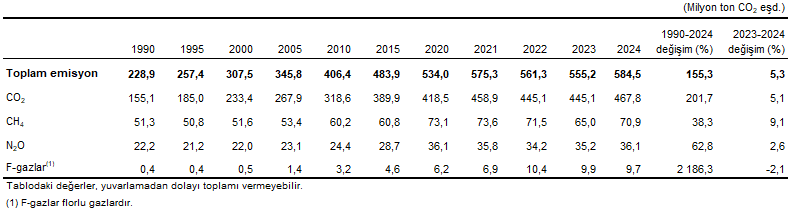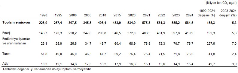 Sera gazı envanteri sonuçlarına göre, 2024 yılı toplam sera gazı emisyonu bir önceki yıla göre %5,3 artarak 584,5 milyon ton (Mt) CO2 eşdeğeri (eşd.) olarak hesaplandı. Kişi başı toplam sera gazı emisyonu 1990 yılında 4,2 ton CO2 eşd., 2023 yılında 6,5 ton CO2 eşd. ve 2024 yılında 6,8 ton CO2 eşd. olarak hesaplandı.