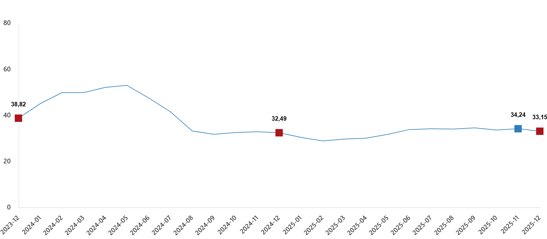 Tarım-GFE’de (2020=100), 2025 yılı Aralık ayında bir önceki aya göre %1,30 artış, bir önceki yılın Aralık ayına göre %33,15 artış, bir önceki yılın aynı ayına göre %33,15 artış ve on iki aylık ortalamalara göre %32,50 artış gerçekleşti.