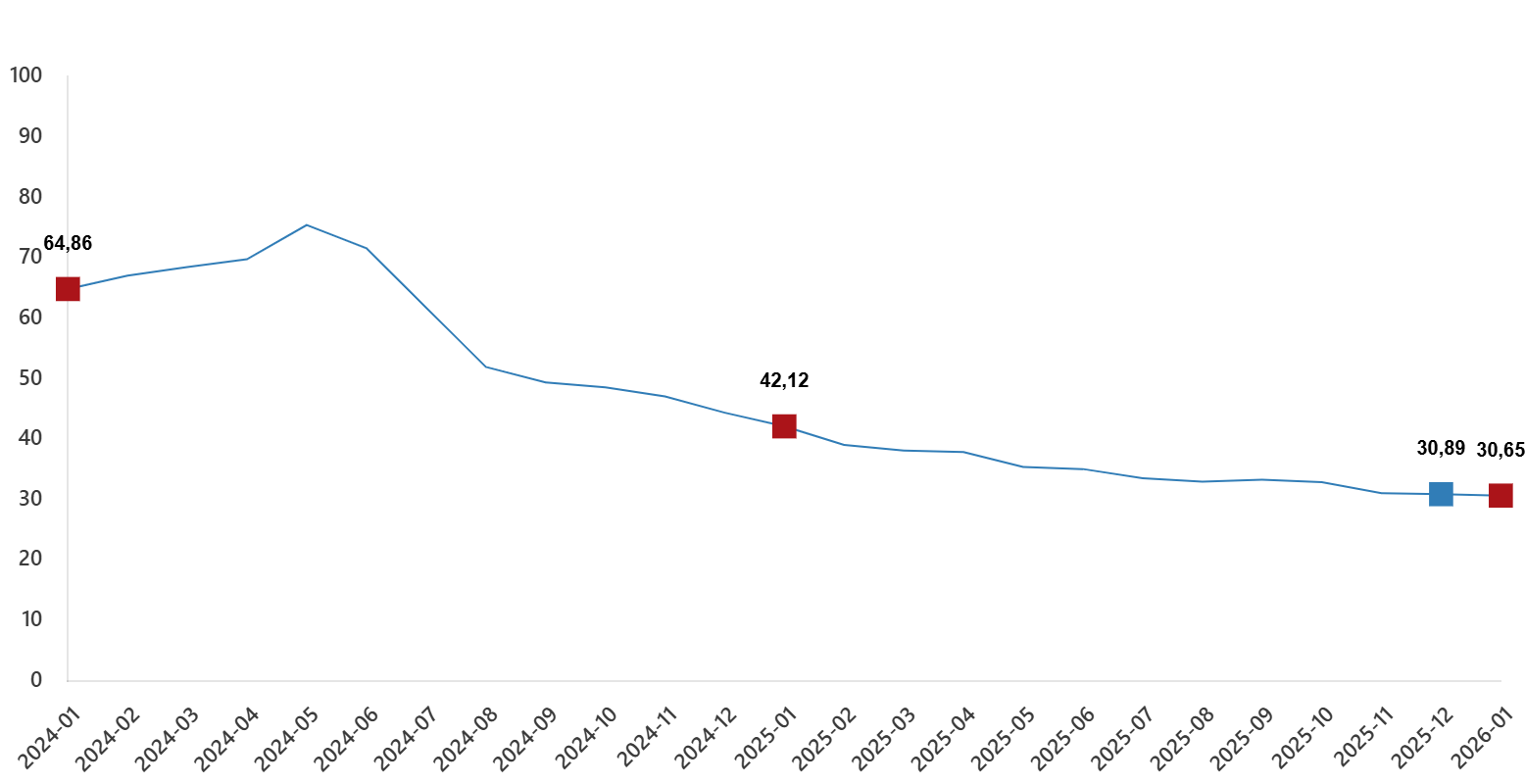 TÜFE’deki (2025=100) değişim 2026 yılı Ocak ayında bir önceki aya göre %4,84 artış, bir önceki yılın Aralık ayına göre %4,84 artış, bir önceki yılın aynı ayına göre %30,65 artış ve on iki aylık ortalamalara göre %33,98 artış olarak gerçekleşti.