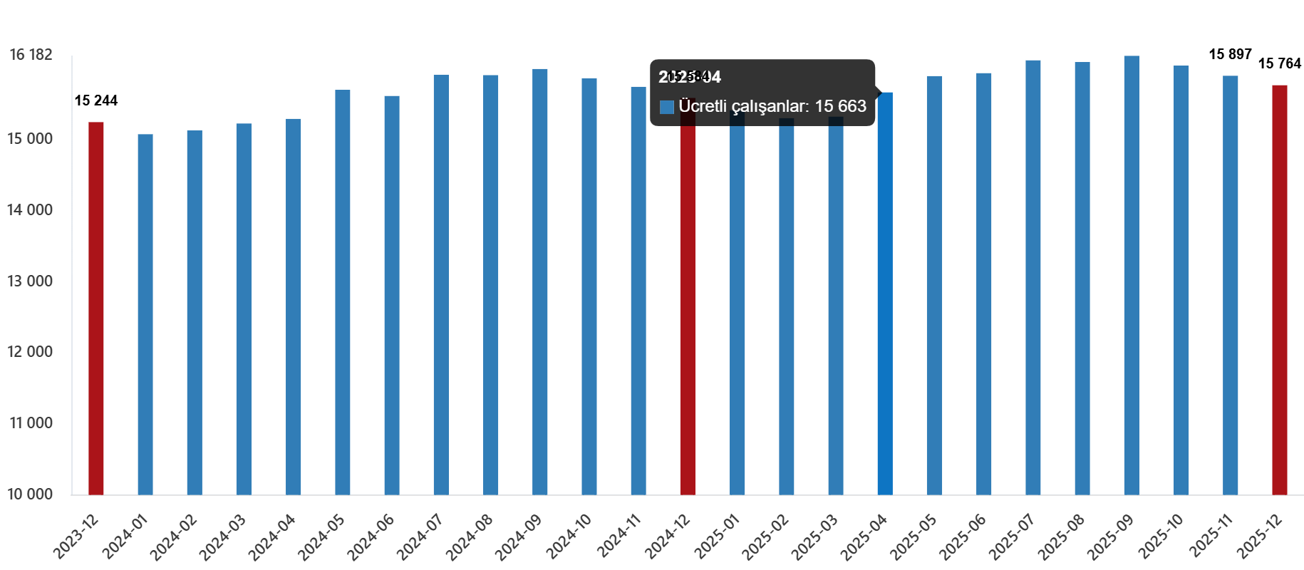Ücretli çalışanların alt detaylarına bakıldığında; 2025 Aralık ayında ücretli çalışanlar aylık olarak sanayi sektöründe %0,1 azaldı, inşaat sektöründe %0,6 arttı ve ticaret-hizmet sektöründe %0,2 arttı.