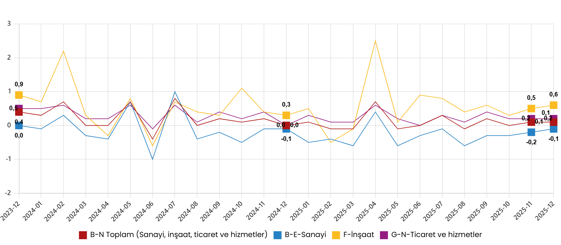 Sanayi, inşaat ve ticaret-hizmet sektörleri toplamında ücretli çalışan sayısı 2025 Aralık ayında bir önceki aya göre %0,1 arttı.