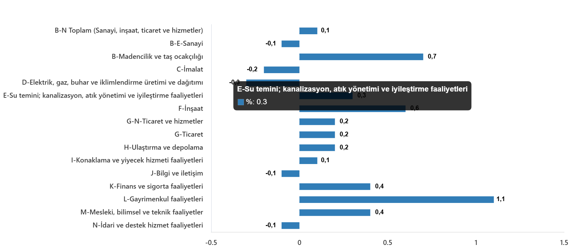 | E-Su temini; kanalizasyon, atık yönetimi ve iyileştirme faaliyetleri | 64 357 | 66 665 | -2 308 | -3,5 |
