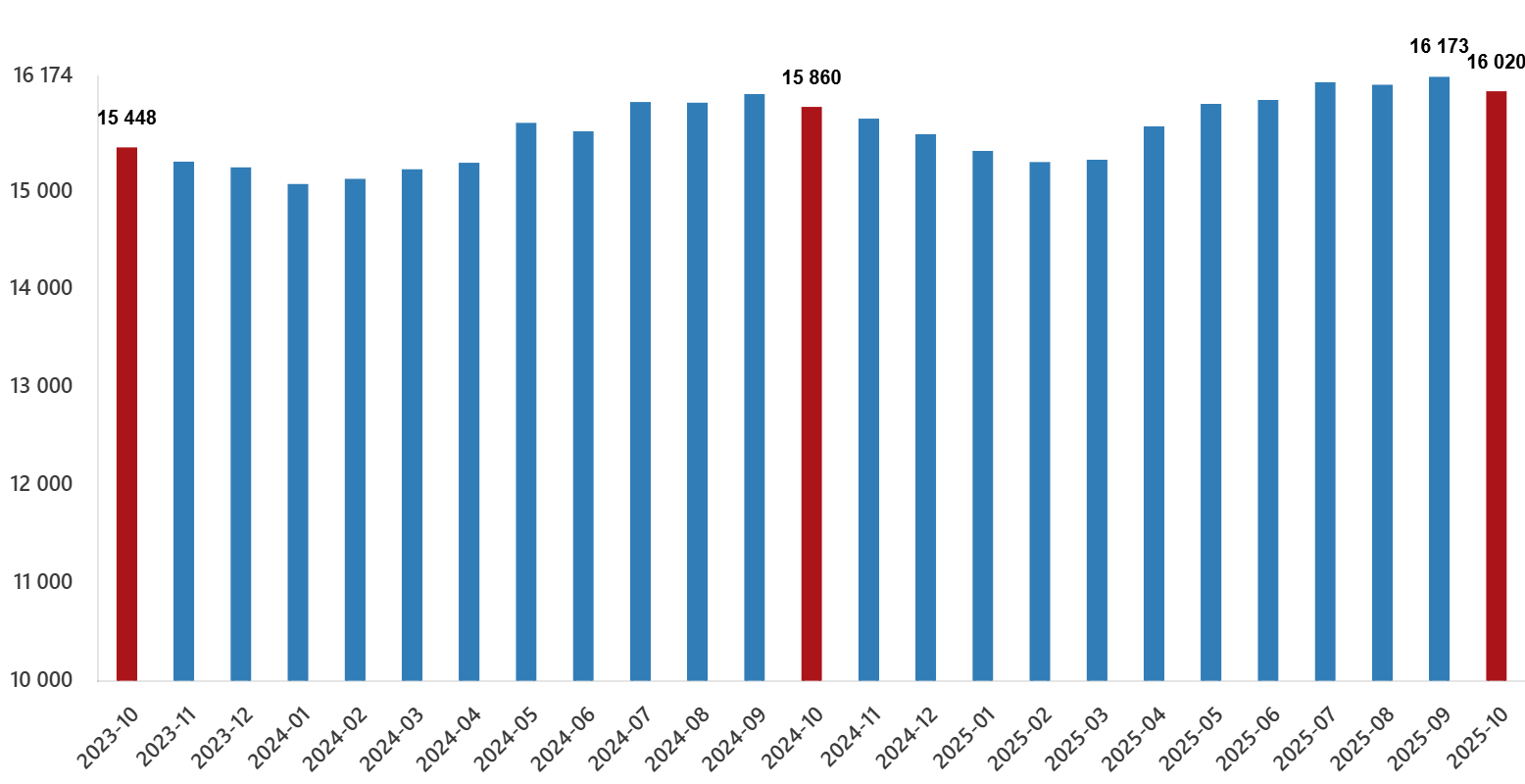 Sanayi, inşaat ve ticaret-hizmet sektörleri toplamında ücretli çalışan sayısı 2025 Ekim ayında bir önceki yılın aynı ayına göre %1,0 arttı. Ücretli çalışan sayısı bir önceki yılın aynı ayında 15 milyon 860 bin 31 kişi iken, 2025 yılı Ekim ayında 16 milyon 20 bin 394 kişi oldu.