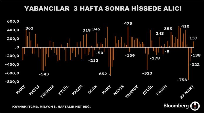 27 Mart haftasında yabancı üç haftanın ardından yeniden alıma geçti. Yabancı 27 Mart haftasında 137,1 milyon dolarlık hisse aldı.